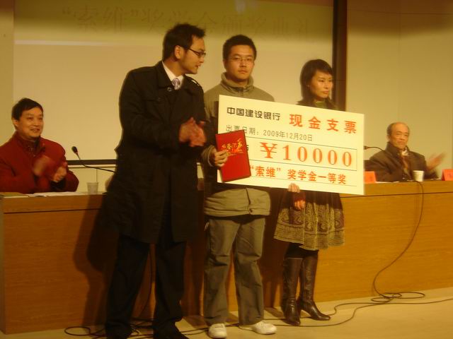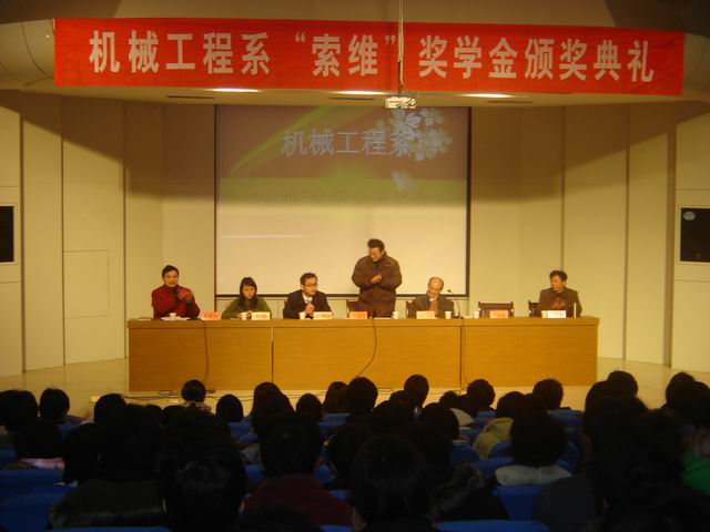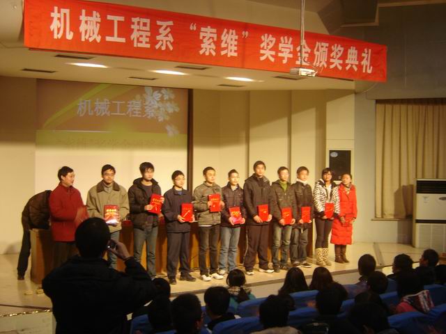 12月20日下午4:30,2009年机械工程系“索维”奖学金颁奖典礼在学术报告厅隆重举行。上海索维机电设备公司副总经理朱振宇、上海索维集团行政部经理李燕、机械工程系副主任许德章及项宁、何芝仙、黄炜等老师出席了典礼,典礼由系党总支副书记邓英扣主持。