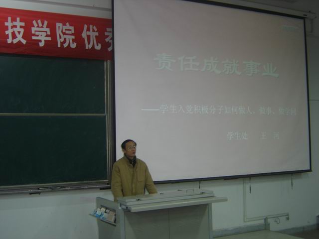 为进一步培养机械工程系分党校第17期全体学员的党员意识和责任意识, 12月29日晚7点学生处处长王河在5教217做了主题为“责任成就事业——学生入党积极分子如何做人、做事、做学问”的专题讲座。本期党课教育培训班班主任张礼波老师及全体学员出席此次讲座。