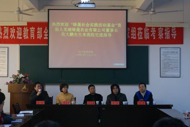 2009年12月30日,艺术设计系在7教会议室举行“绿晟社会实践活动基金”设立仪式。芜湖绿晟农业有限公司董事长范大鹏、系党总支书记许晓菁、系主任黄凯、副主任陆峰、电艺教研室主任承杰、团总支书记郑千里和教师代表、学生代表70余人出席了设立仪式。仪式由许晓菁主持。