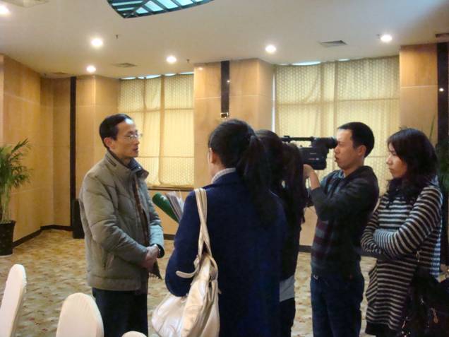 王河在新闻发布会现场接受采访
