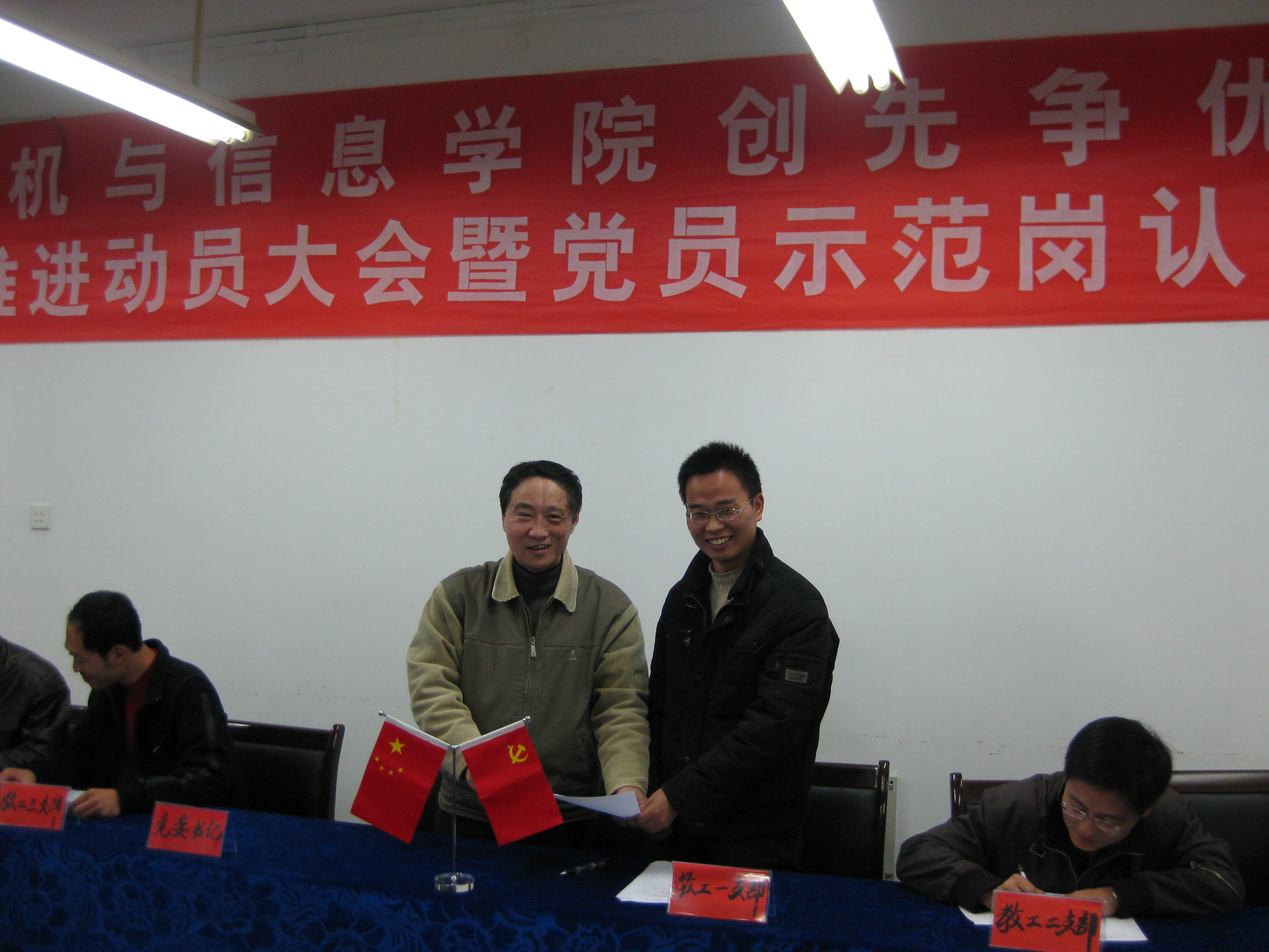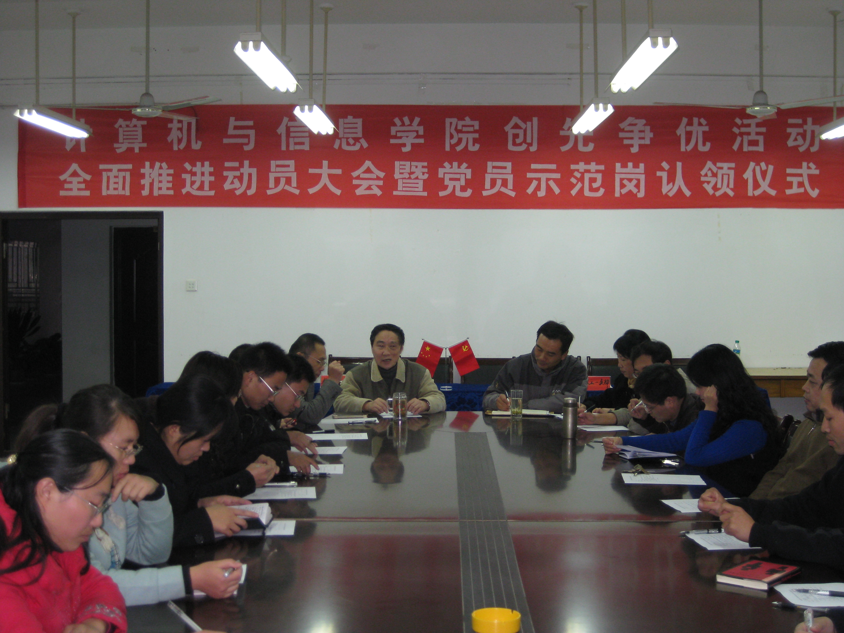 为进一步贯彻落实学校党委关于《做好创先争优活动全面推进阶段有关工作的意见》的文件精神,计算机与信息学院党委于1124日下午在学院会议室举行了 创先争优全面推进动员大会暨党员示范岗认领签字仪式。会议由学院副书记周毅仁主持,全院各党支部书记及全体党员参加了会议。