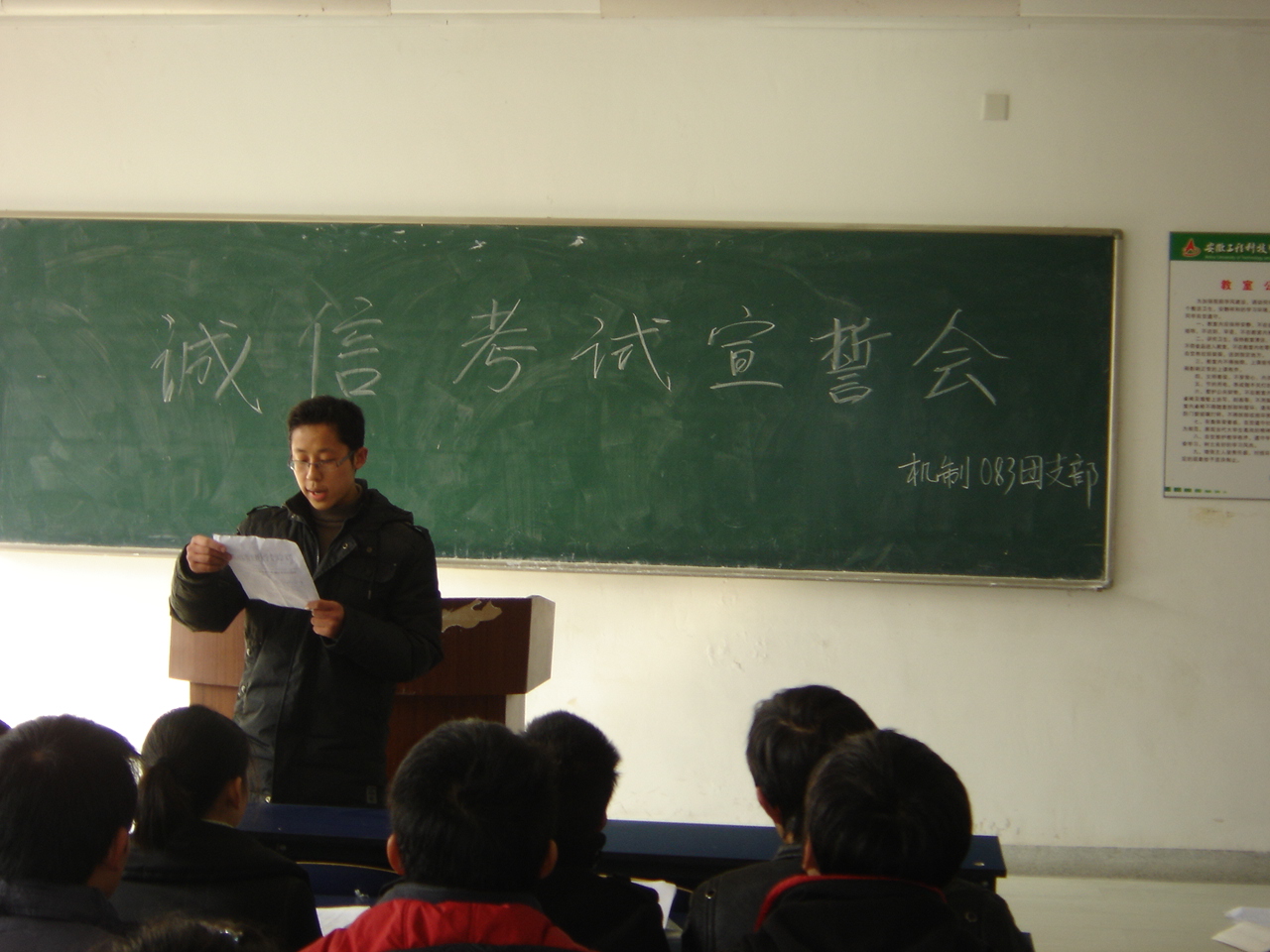 为贯彻落实我校“三做”育人理念,扎实推进团员创先争优活动,机械与汽车工程学院机制083团支部班于111日上午10:306J202召开举行诚信考试宣誓大会,学院团委书记黄炜出席会议,会议由团支部书记宋春亮主持。