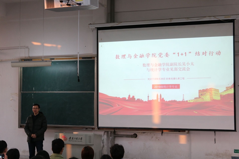 新生群体、考研学生、学业困难学生一直是数理与金融学院党委放在心上的重点关注群体。为帮助2020级新生尽快适应大学生活,明确学习目标,周毅仁与统计201班、202班开展党政领导对接班级见面会,以“新起点、新长征、新目标”为主题,为新生们详细讲解了专业特色和重点学科,鼓励他们规划好自己的大学生涯,结合自身实际和特长树立目标。副院长吴小太与2019级统计专业学生开展党政“1+1”面对面交流会,为同学们合理规划大学生活引路指航。同时,刘书记与全体辅导员也多次走访学生宿舍,关心2020级新生在校的动态,了解他们的学习生活情况。