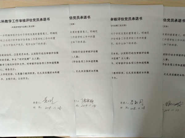 首先,学院黄焰结院长和唐雪梅副院长充分肯定了教工党员在审核评估预评估中的良好表现和重要作用,并就审核评估的重要性和意义做了动员讲话,对相关工作做了安排,特别强调了审核评估中党员的先锋模范作用。随后,宣传委员韩利敏带领大家学习了学校《关于基层党组织和党员在本科教学工作审核评估中进一步发挥作用的通知》的有关要求。之后,大家结合本职工作就审核评估的准备,自己在审核评估中的收获,目前存在的问题及解决对策等展开了热烈讨论,特别是针对自己的本科教学做了总结和反思,每位党员老师都各抒己见,发言精彩纷呈,对大家非常有启发。在活动中,全体党员签署了“本科教学工作审核评估党员承诺书”,郑重承诺:提高政治站位,凸显党员本色,以实际行动为审核评估做出应有的贡献,争当“迎评促建”主人翁;认真学习相关知识和文件,对审核评估的各项和流程工作熟悉在心,准备充分;服从学校安排,认真履行教师职责,扎扎实实搞好本科教学工作,自觉行动,主动作为。大家纷纷表示要积极宣讲有关审核评估的知识,把动员学习、交流讨论的所学所获、所思所想、所感所悟传递给身边的同志。