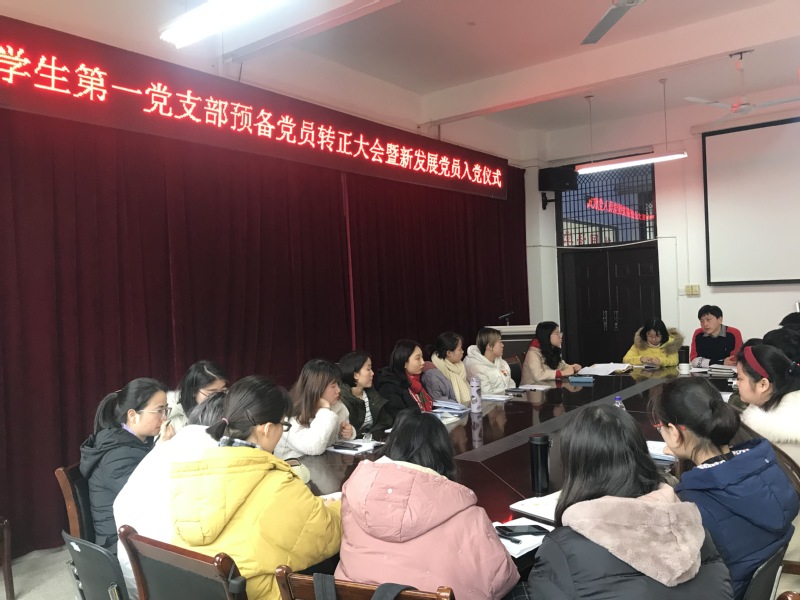 2019年12月25日,外国语学院学生第一党支部举行预备党员转正大会暨新发展党员入党仪式。会议由支部书记张君主持。