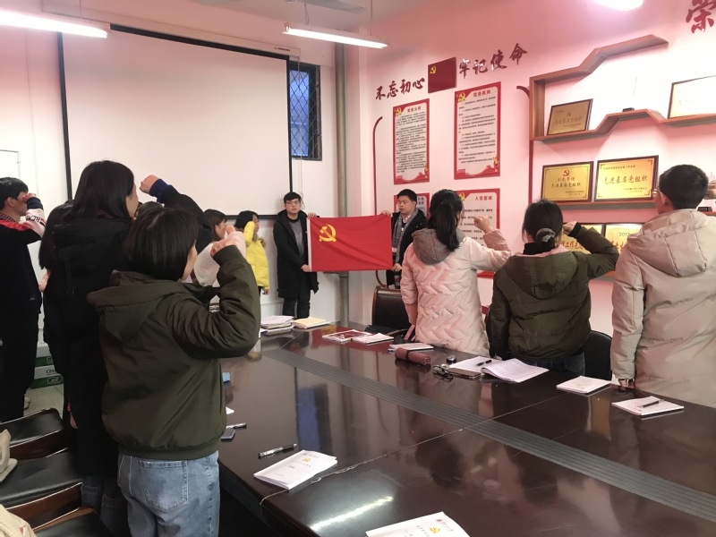 在新发展党员入党仪式上,支委委员张君、张雅静、牛璐为新党员颁发《中国共产党章程》、佩戴党员徽章。随后,7名新发展党员在张雅静的带领下,面对党旗,郑重举起右手,庄严宣誓,誓词声声,表达了党员们为共产主义事业奋斗终身、永葆党员先进性的坚定信念。参加会议的其他党员也一起重温了入党誓词。