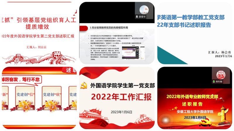学院三个教师党支部和三个学生党支部书记分别就落实本年度基层党建工作进行述职。大学英语第一教师党支部将推进英语口语教学改革,提升学生英语口语水平融入党支部标准化建设;大学英语第二教师党支部作为“安徽省五一巾帼英雄岗”先进集体,分享了支部在创先争优方面的经验做法;外语专业教师党支部结合新文科认证具体工作,阐述支部在引领课程和专业建设、人才培养和服务社会以及课程思政建设方面取得的成绩;研究生导学支部作为新成立的师生混合型党支部,聚焦研究生教育培养目标开展系列对口活动,以高质量研究生党建引领更高水平研究生教育培养与学位点建设;学生第一党支部围绕样板党支部建设,将学生教育管理融入“七个有力”建设过程;学生第二党支部以“1+3”党建共建项目为载体,推动基层党组织育人工作提质增效。