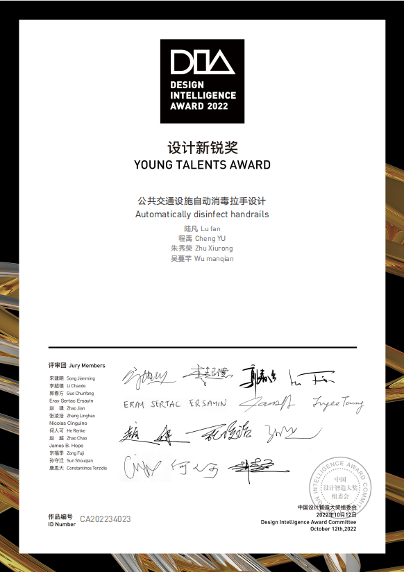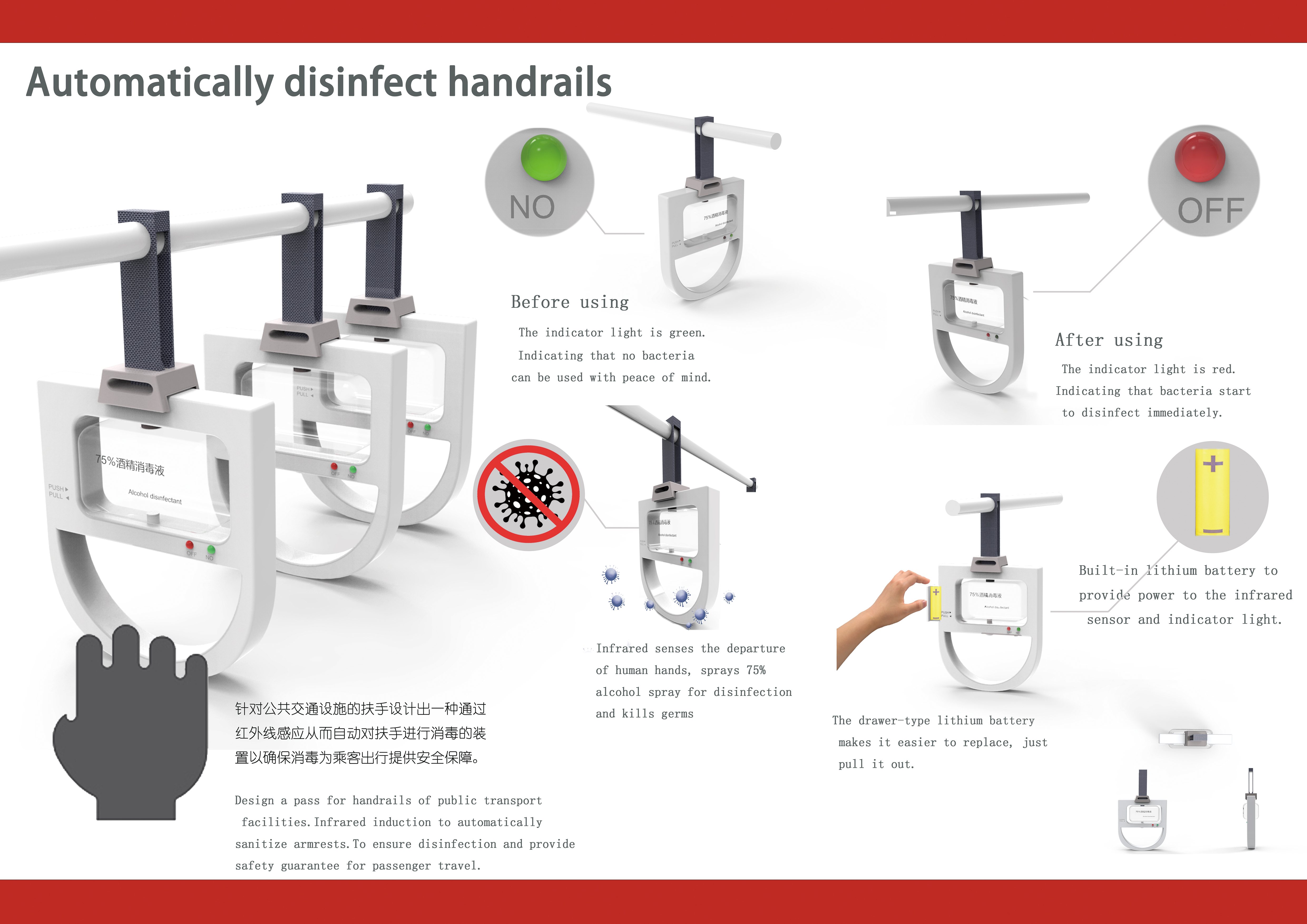 2023312日晚,第七届中国设计智造大奖 (DIA) 颁奖典礼在绍兴柯桥国际会展中心盛大启幕。 设计学院2021级艺术专业研究生陆凡、程禹、朱秀荣、吴蔓芊同学组成的团队创作的《公共交通设施自动消毒拉手设计》(指导教师:金东)荣获大赛概念组 “设计新锐奖”。该设计体现了问题解决导向的设计思想,通过红外线感应而对拉手进行自动消毒,切实解决了公共交通设计消毒问题。公共交通设施的扶手,因受到乘客频繁使用,存留着大量细菌,人们在触摸这些扶手后容易造成交叉感染。针对这一痛点,设计出一种通过红外线感应从而自动对扶手进行消毒的装置,以达到节省人力资源和确保充分消毒、保证通勤安全的目的,为乘客出行提供安全保障。公共交通设施消毒扶手装置结构巧妙,具有易安装、易拆卸、适配性强等优点。在使用方式上采用了最直观的红绿灯可视化显示,当指示灯为绿色时表示已消毒,使用者可以安心使用扶手,而感应器感应到手部离开时,会自动对扶手进行消毒,指示灯则为红色。